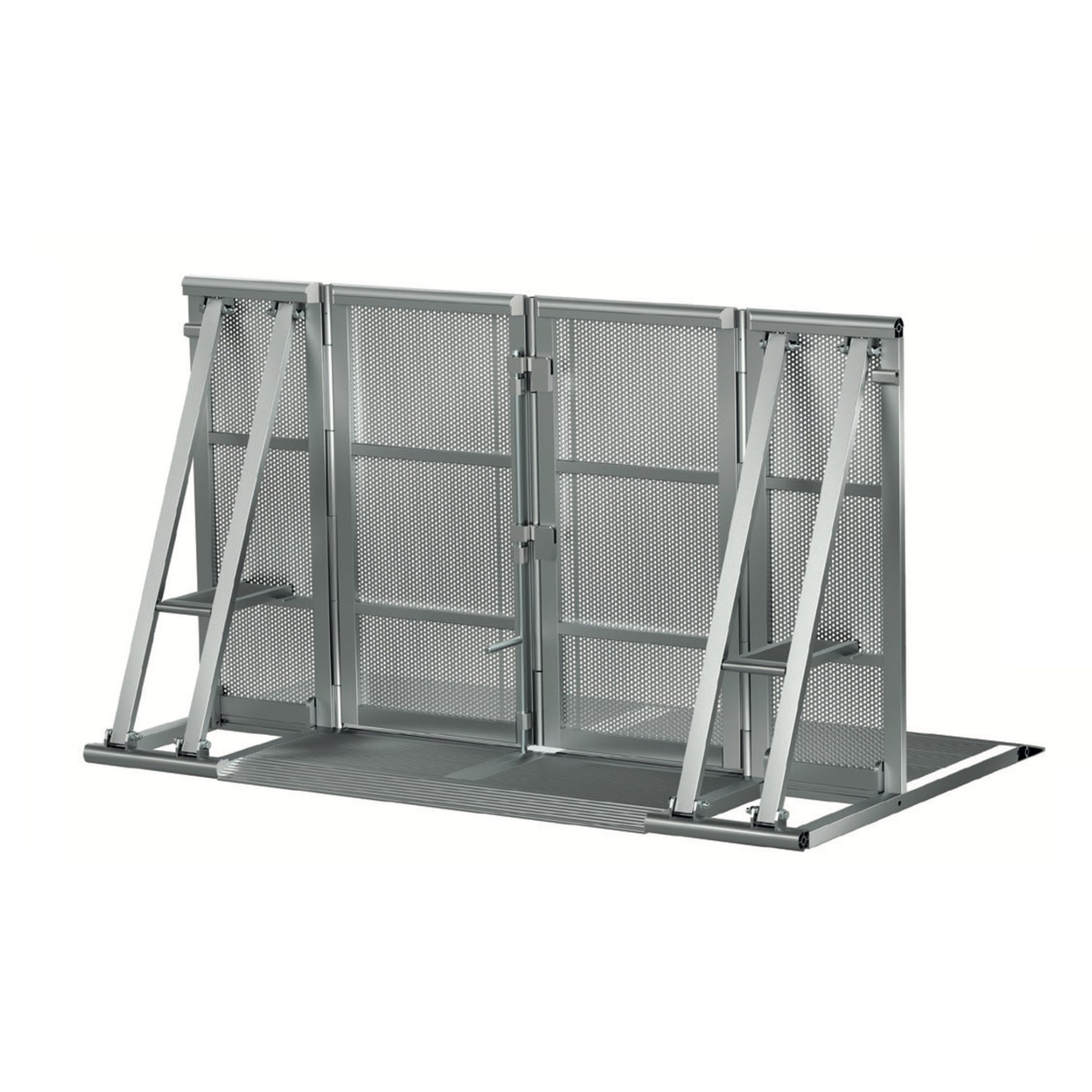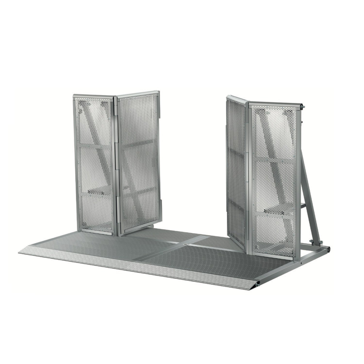 The CWB-EG Emergency Gate Module is a specialized crowd barrier component designed for rapid access in critical situations during events. The emergency gate module provides a double wide, 45 1/4" (115 cm) opening for rapid ingress or egress and to allow emergency services easy access with a gurney, etc. It features steps above the floor plate for easier lifting of persons with health issues over the barrier, making it an essential part of professional crowd control systems for concerts, festivals, or public gatherings—suitable for truss experts managing safety setups or venue operators ensuring compliant barriers.