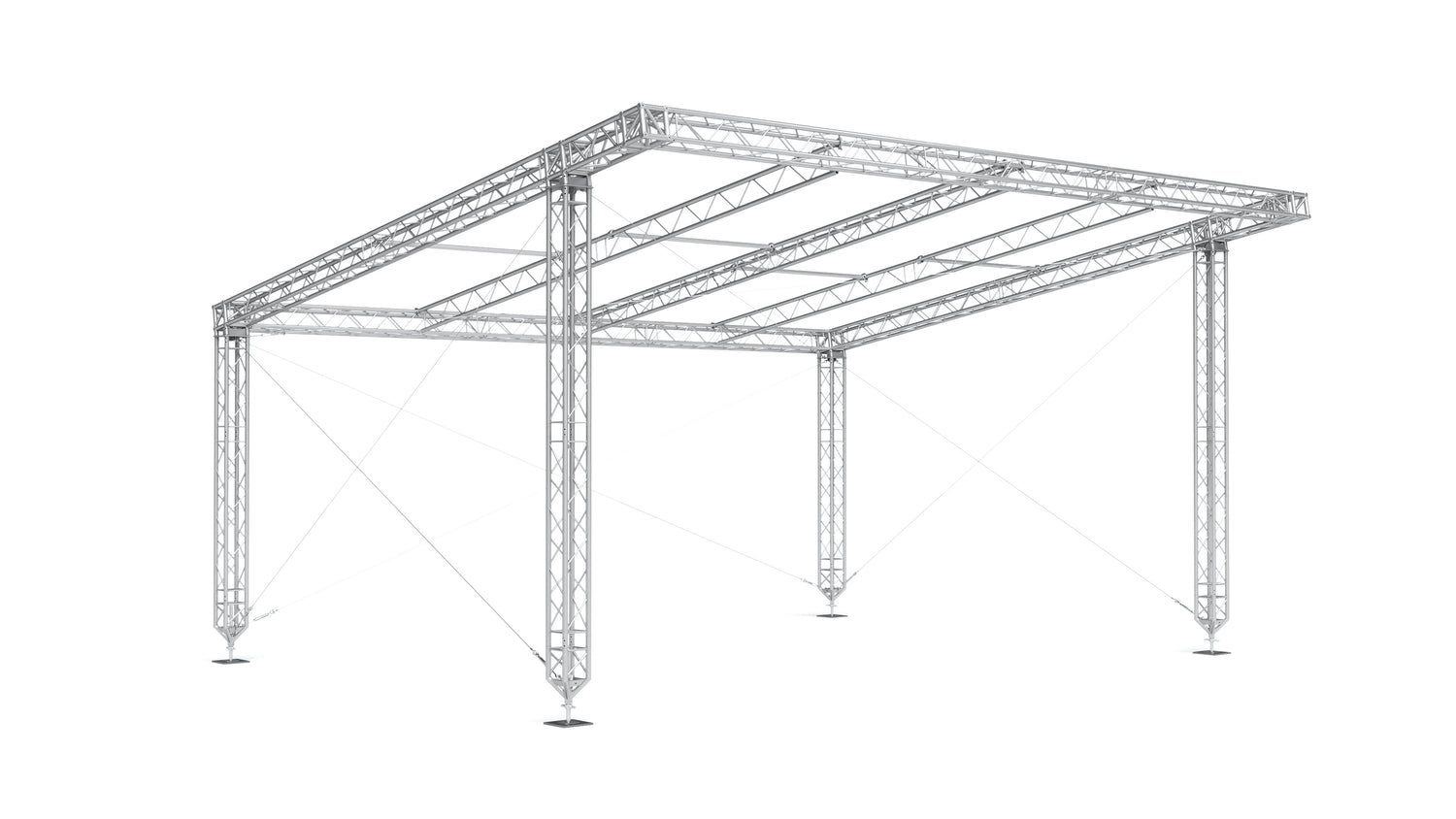 The MR0 Sloping Roof 8x6 m (26.25' x 19.69') is a professional aluminum sloping roof system designed for medium to large temporary events, featuring a heavy-duty M290 Quatro structure with Duo canopy support. The gentle sloping design—created with special wedges and reinforced multicubes—ensures effective water runoff, reduced wind loads, and a modern aesthetic while delivering high stability and quick assembly. Supplied complete with internal wind bracing wires and connection accessories, it comes with a full structural calculation report and build manual. This roof suits indoor or outdoor use with clear access from all sides—perfect for truss professionals needing efficient setups or occasional users seeking a simple, dependable covering solution with reliable drainage.